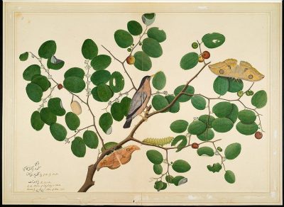 Illustrations : 1/ « Loriot à tête noire » 2/ « Étourneau brahmanique, chenille, cocon et papillons sur un jujubier » 3/ « Grue Antigone » Sheikh Ain ud-Din (élève de Lady Impey) XVIIIème.