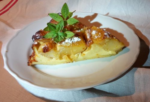 Ingrédients : 5 pommes, 4 œufs, 45 g. de sucre, 80 g. de farine, 25 cl. de lait, 2 c.à soupe de rhum.