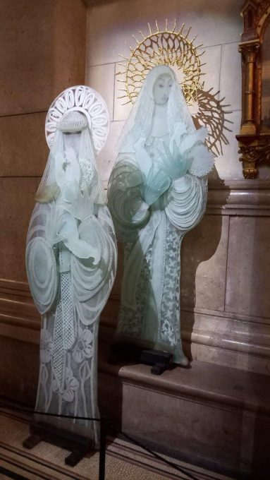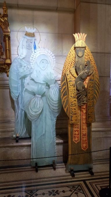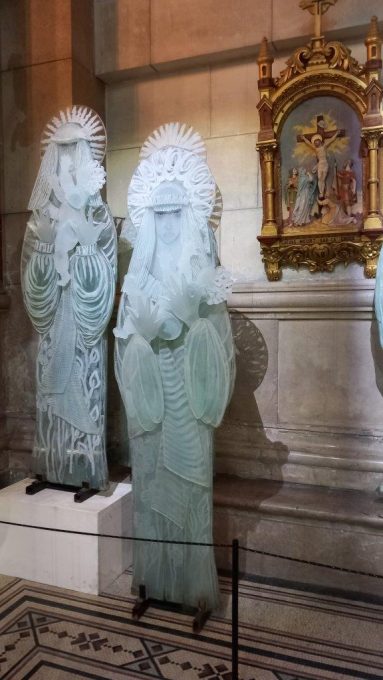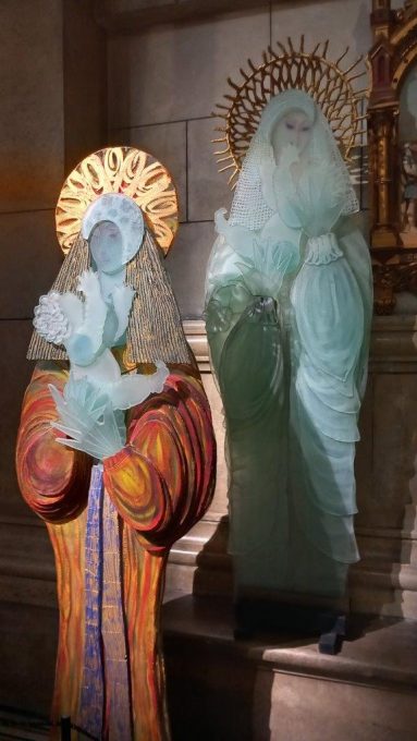 Dans les nefs latérales, 50 Vierges transparentes, noires, dorées ou blanches,